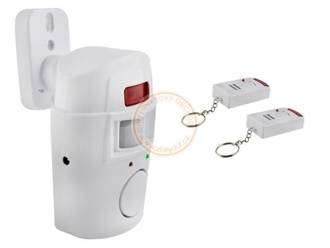 Alarm s pohybovým čidlem PIR zabudovanou sirénou a dvěma ovladači s dobrou odolností proti falešným poplachům