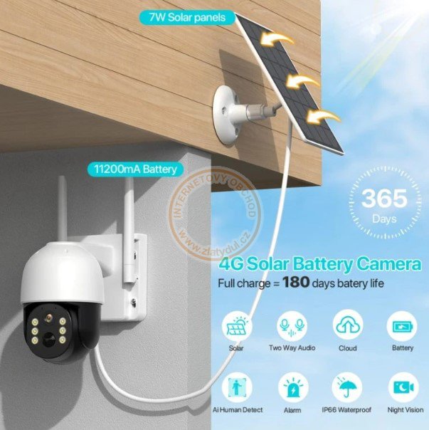 Kamera PTZ 4G je velice výkonná venkovní bezpečnostní kamera se solárním napájením, která zaručuje prvotřídní dohled nad vaším majetkem za všech okolností a za každého počasí, ve dne i v noci. Díky technologii 4G je tato kamera ideální pro místa bez přístupu k tradičnímu internetovému připojení. Díky plynulému otočení, náklonu a přiblížení umožňuje uživatelům sledovat široké území s vynikajícími detaily a bez mrtvých úhlů. Na víc tato kamera disponuje i WiFi připojením, takže záleží jen na vaší volbě, který způsob připojení použijete.