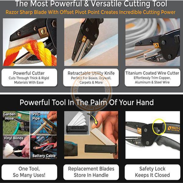 Na řezání, stříhání a dělení různých materiálů od papíru až po kov. Praktický řezací nástroj, který si poradí se stříháním a krácením nejrůznějších materiálů. Ostří se skládá z čepele a posuvné základny, její vtažením dovnitř získáte ořezávací nůž. Navíc obsahuje speciální štípací čepele na krácení kabelů. Čepele pro vysoké zatížení - čepele jsou tepelně upravené a tvrzené z uhlíkové oceli a jsou extrémně stabilní. Nůžky mají také pojistku proti nechtěnému otevření. Ostrá čepel vytváří neuvěřitelnou řeznou sílu, za každých okolností zůstává neskutečně ostrá. Multifunkční nůžky Multi-Cut 3v1 jsou nezbytným pomocníkem jak do dílny či garáže, či na zahradnické práce. S jejich pomocí snadno nařežete také sádrokarton, koberec či lepenku. Můžete také stříhat kabely, dráty i kůži. Stejně je můžete bezpečně použít na gumu, hliník, plasty a na odstranění drobných větviček.