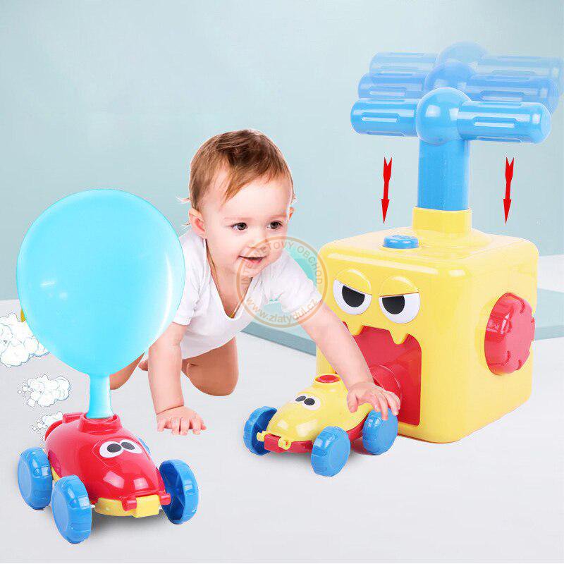 V sadě najdete velkou kostku s pumpičkou, autíčka a balónky. Princip je velmi jednoduchý. Děti balónek umístí do autíčka. Autíčko přidělají ke kostce s pumpičkou a balónek nafouknou. Pak už jen stlačí tlačítko start a autíčko se uvolní a vyrazí rychle kupředu. Ve větší sadě je navíc modul pro raketu. Ta po nafoukání a stisknutí tlačítka vystřelí vzhůru. Nejsou potřeba baterie, vše je z bezpečnostního ABS plastu.